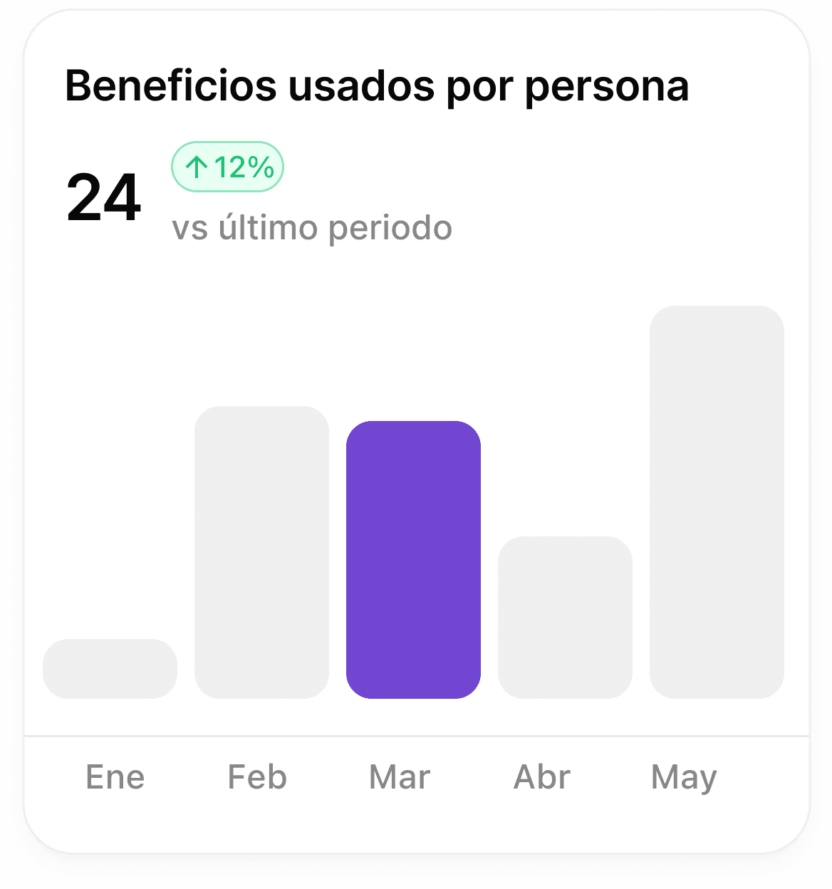 Accede a métricas en tiempo real sobre el uso, preferencias y presupuesto en la plataforma. Una herramienta perfecta para RR.HH. y Finanzas.